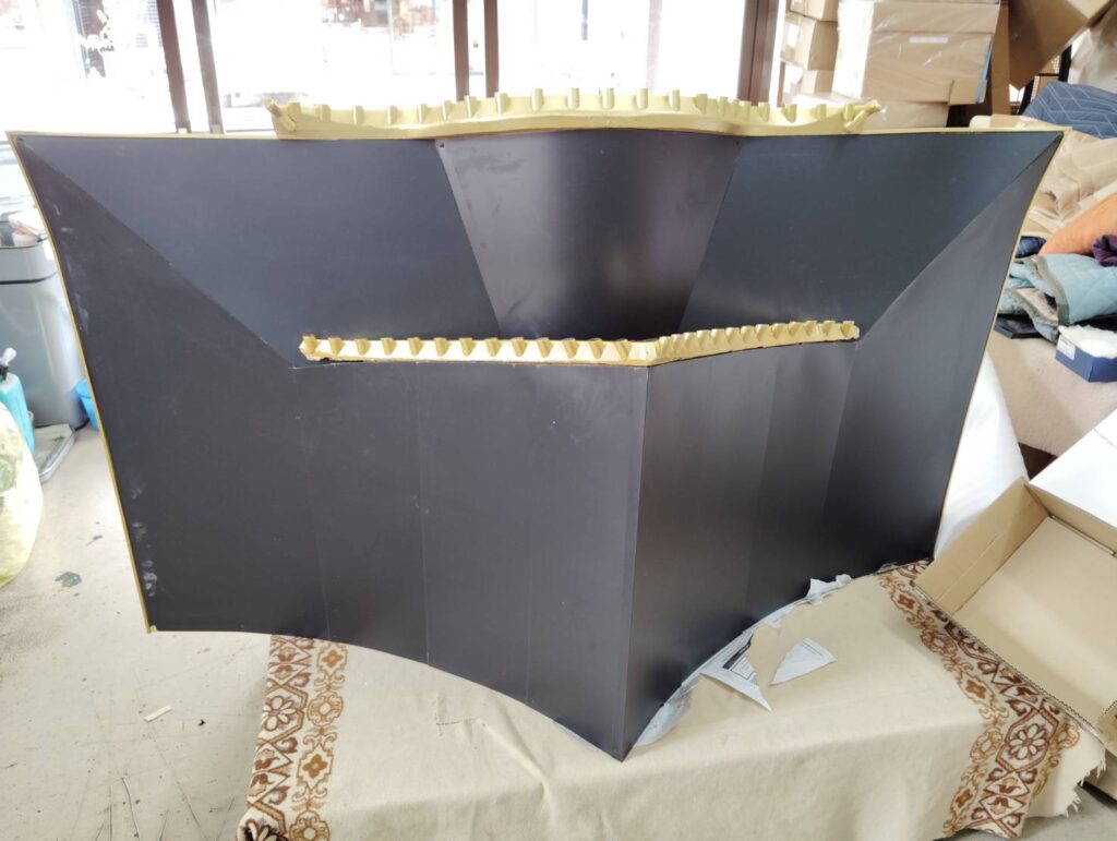 経年による埃の堆積と損傷がありましたが、綺麗にお洗濯をしたうえで、傷を修復し、天井は黒、内側は金で新品に近い状態に修復出来ました。